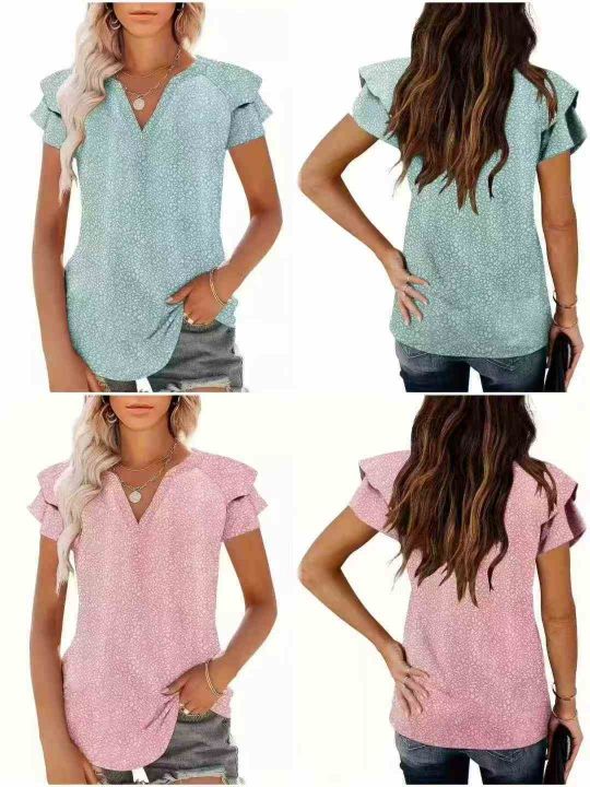 [爆竹][爆竹]3.9清700件欧美时尚休闲V领印花荷叶边袖口短袖,整款,花型图...